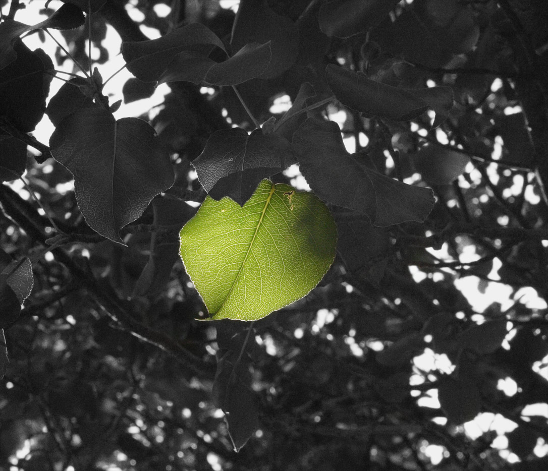 a leaf photo taken on the Virginia Tech campus, dual layered to color the leaf and leave the rest a subtle black and white