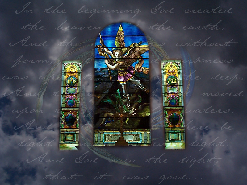 my own photos here, clouds and stained glass from St. Michaels Church in Charleston, SC along with Genesis in the background